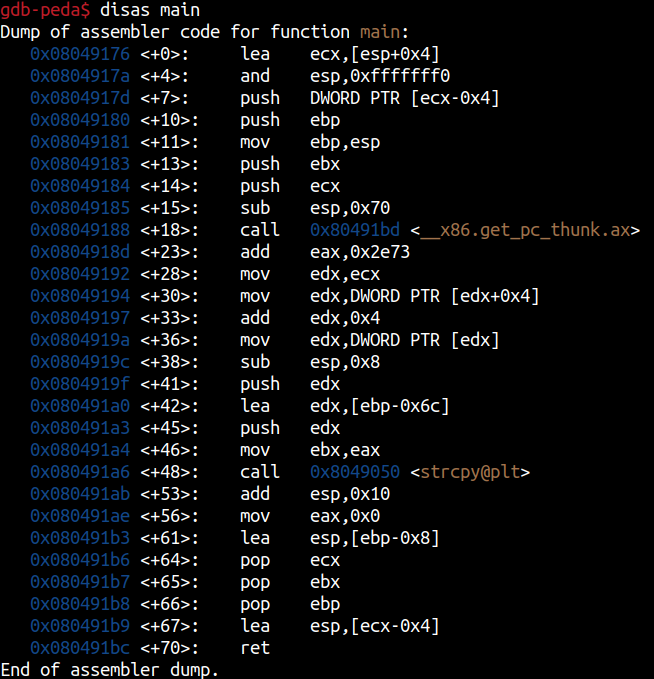 This starts to paint a picture of how we can exploit our program and start controlling registers post-overflow. If you're familiar with x86 ASM on older 32-bit systems, this may feel a little more verbose and complex than what we usually see. Even though we compiled this using the -m32 flag, since our host OS is a newer 64-bit system, other factors such as compiler version changes, Application Binary Interface (ABI) differences, newer stack unwinding techniques, and more influence what we see on these ASM dumps. It'll also play a role when we eventually craft our exploit, but we'll get to that soon.