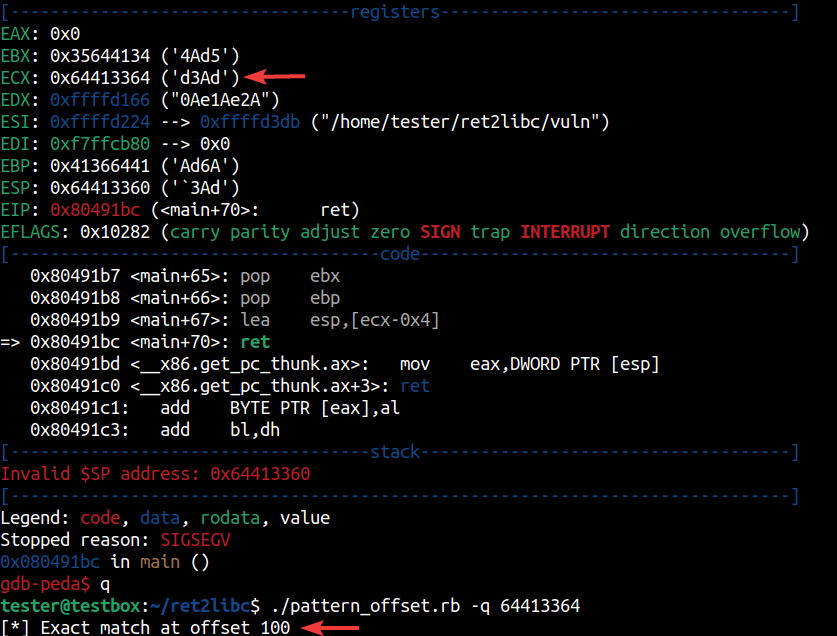 What we want to do next is calculate the offset where ecx is stored, then overwrite it with the correct address, which we can then use to control what the return instruction will execute next. We can do this using tools from the Metasploit arsenal called pattern_create.rb and pattern_offset.rb. We'll create a random 130 character string, analyze the resulting segmentation fault, grab ecx, and calculate our offset.