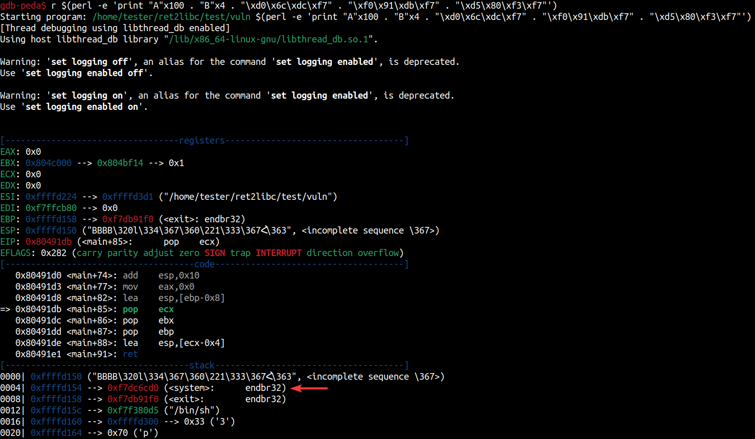 0xffffd154 on the stack, this is where we'll want to point esp to. If you take note of the code section, we can see that the second to last instruction of 0x80491de <main+88>: lea esp,[ecx-0x4] indicates that we'll want to do to fill that dummy 'BBBB' we pushed up above. We'll have to add that 0x04 to that system address, giving us 0xffffd158, which we'll pass as "\x58\xd1\xff\xff". Let's clear that breakpoint and see what happens.