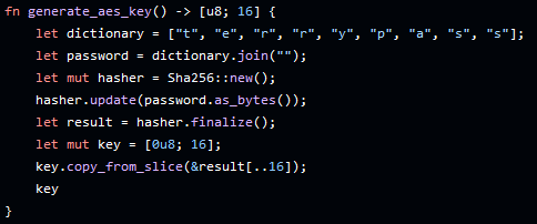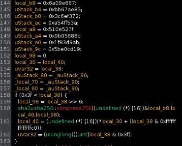 0x6a09e667, 0xbb67ae85, etc. as well as the if-statement processing the input data. This long block is the result of the following code seen in the repo: let mut hasher = Sha256::new(); hasher.update(password.as_bytes()); let result = hasher.finalize();, meaning we're stepping through the decryption functionality as expected, since we're executing the generate_aes_key() function. Scrolling through, there are additional steps shown in the decompiled code, such as padding, computation, hash finialization, and memory deallocation - but we don't get much further than that. We can rename this function to sha_computation() and move on.Directly after our newly defined function, we come across