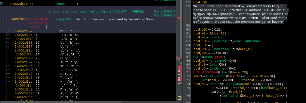 This function is pretty simple. It prints out the ransom note, instructing the user to pay $1,000 USD to the listed BTC address, and submit proof to the provided web address. Then, it lists a prompt allowing the user to type in their decryption key that they're given upon payment. The user's input is checked against the AES-128 key, which has been formatted from bytes into a readable hexadecimal string.